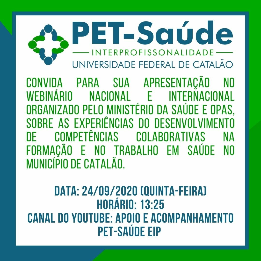 Convidamos à todos para participar da webinário nacional e internacional organizado pela Opas e Ministério da Saúde, que tratará sobre as experiências colaborativas na formação e no trabalho em Saúde, referentes ao Projeto PET Saúde e Interprofissionalidade da Universidade Federal de Catalão.
